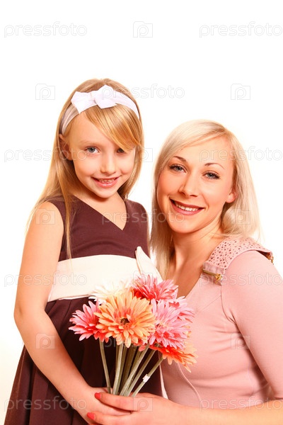 Девочка и женщина с цветами на белом фоне