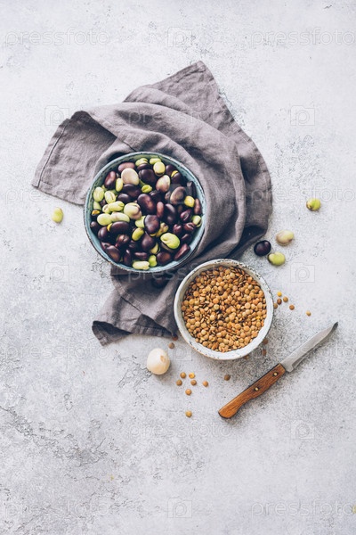 Органические чечевицы и сырые бобы.Ингредиенты для приготовления пищи