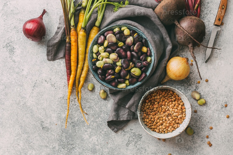 Органические фасоль, чечевица и овощи на сером фоне
