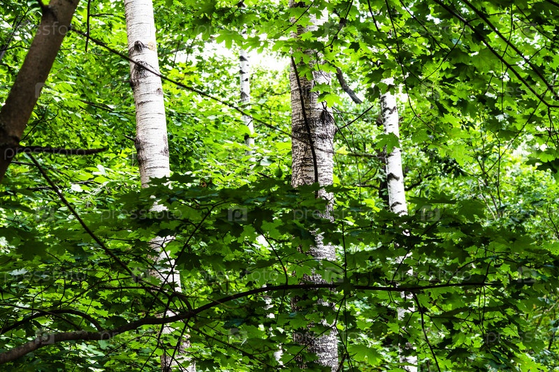 Вид на зелёный густой лес с кленовыми березами