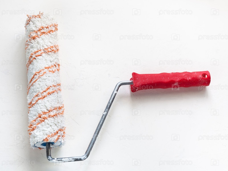 Использованный ролик краски на белой штукатурной поверхности