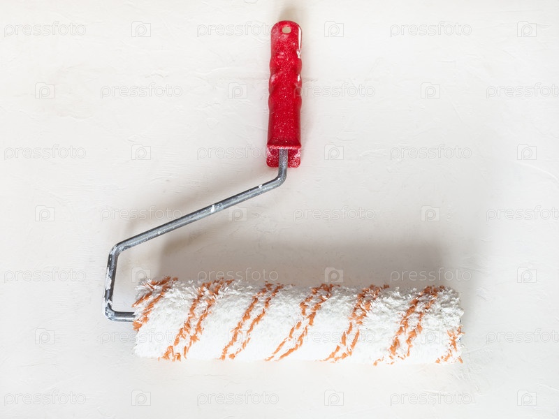 Используемый сухой ролик краски на штукатурной поверхности