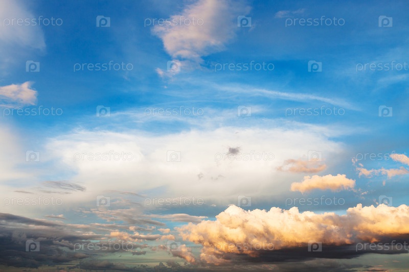 Голубое небо на закате с белыми и желтыми темными облаками