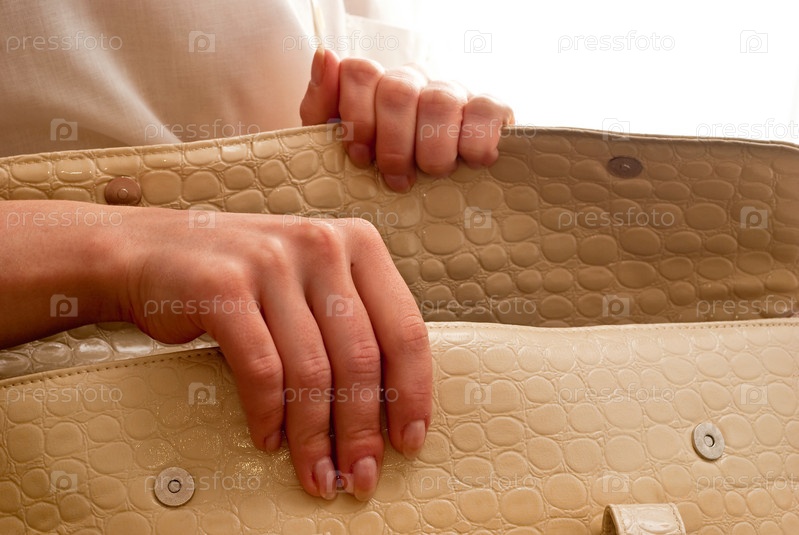 Женщина открывает сумку на белом фоне