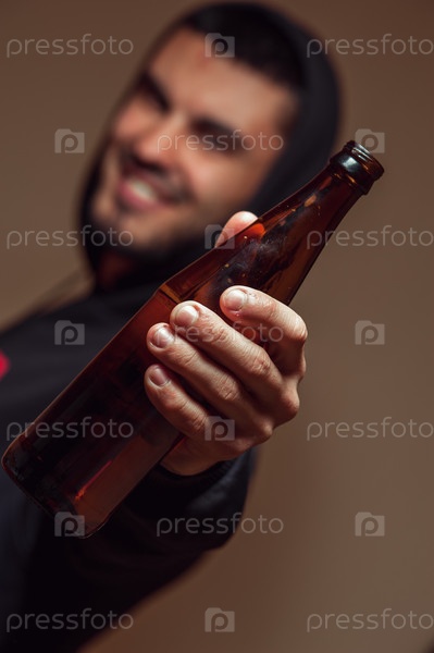 Молодой улыбающийся мужчина держит бутылку пива в руках