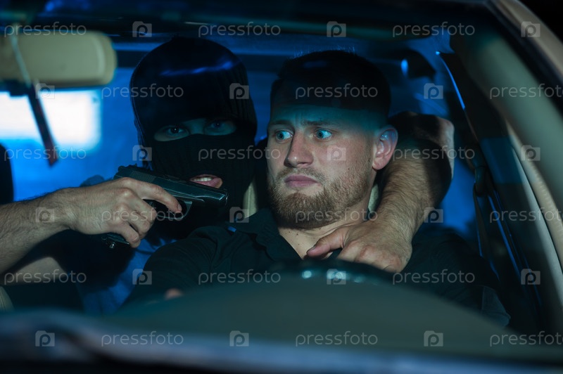 Преступник направляет пистолет на напуганного водителя