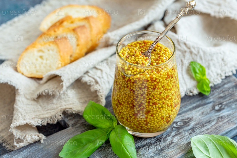 Банка острого горчичного соуса и зеленого базилика