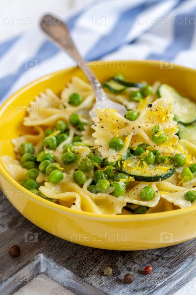 Тарелка с макаронами, кабачками и зеленым горохом