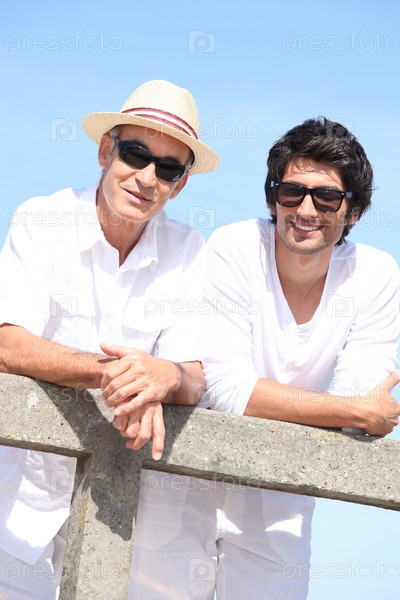 Двое мужчин в белом стоят, опираясь на забор, на фоне голубого неба