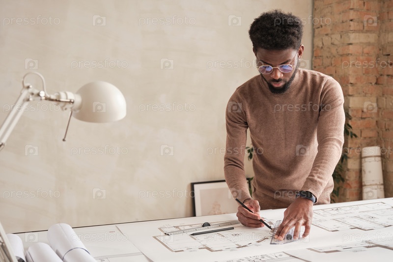 Черный мужчина готовит технический чертеж
