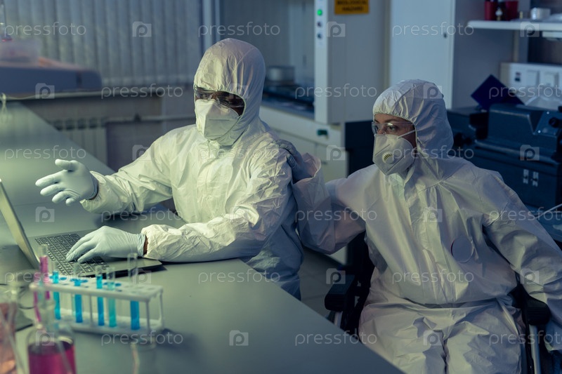 Молодой ученый в комбинезонах объясняет данные своего коллеги-инвалида на дисплее ноутбука