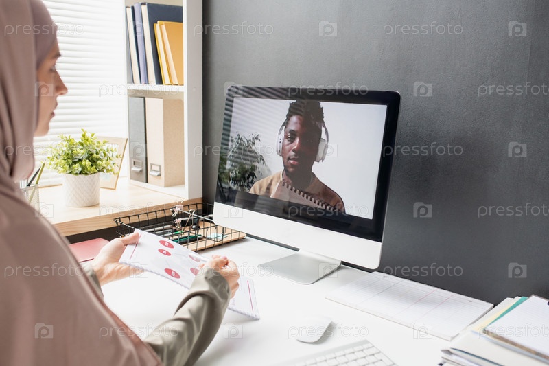 Молодой африканский студент в наушниках на экране компьютера слушает учителя