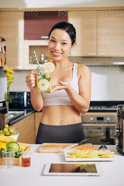 Фитнес-женщина с витаминовым напитком