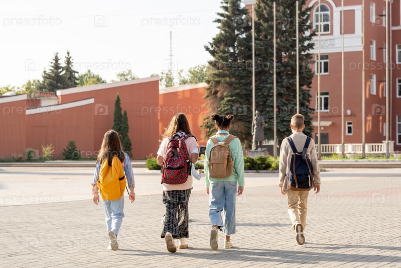 Группа школьников с рюкзаками, идущих в школу утром