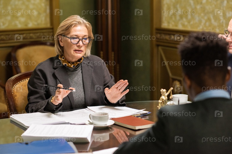 Уверенная в себе блондинка-адвокат разговаривает с молодой африканской коллегой