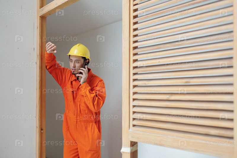 Строительный рабочий разговаривает по телефону