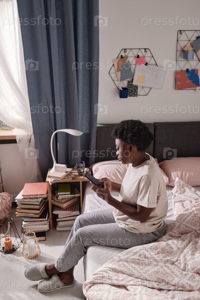 Женщина, использующая мобильный телефон в спальне