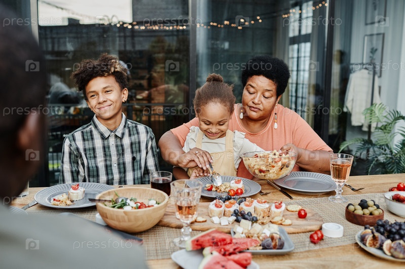 Счастливая бабушка с детьми за ужином