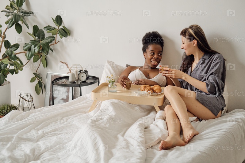 Две счастливые девочки завтракают в постели