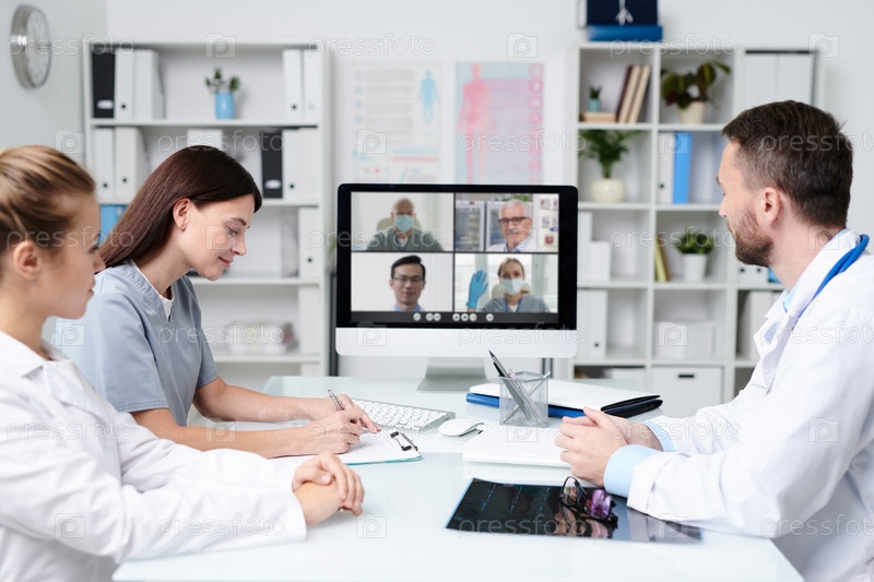Группа практиков, консультирующихся с коллегами во время онлайн-коммуникации