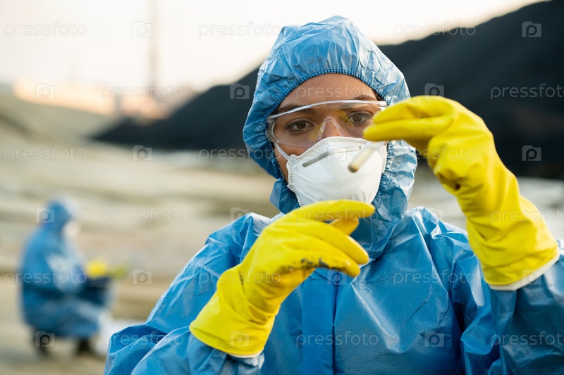 Молодая исследовательница в области защитной рабочей одежды держит образец токсичной почвы в колбе перед лицом