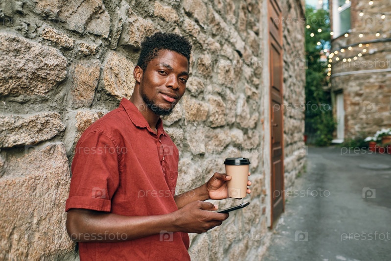 Счастливый молодой африканский мужчина в повседневной одежде прокручивает смартфон и пьет