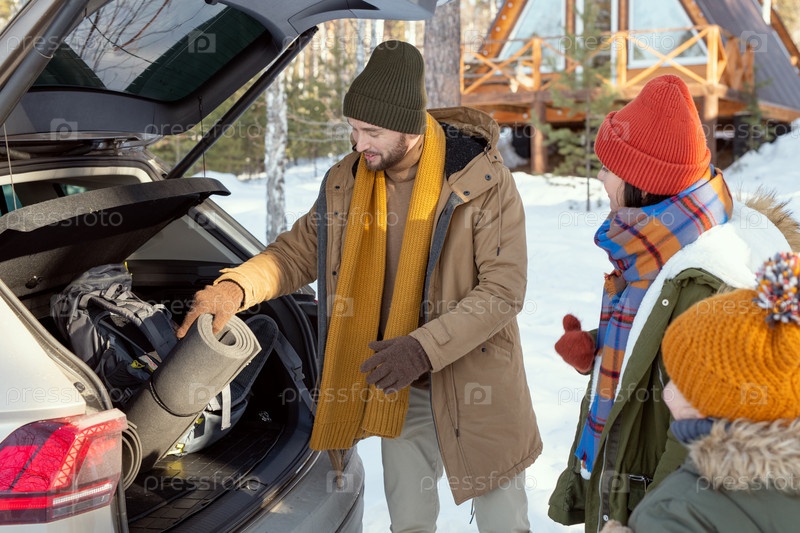 Молодая семья из трех человек в теплых зимних одеждах выносит свой багаж из багажника машины