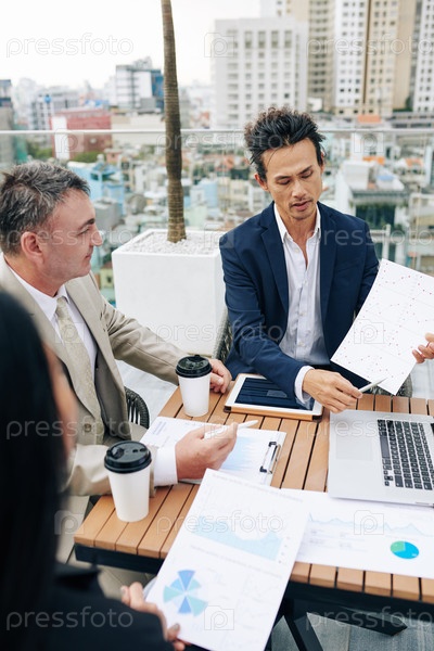 Бизнесмен показывает отчет коллегам