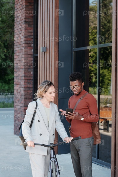 Деловая женщина с велосипедом смотрит на экран смартфона в руках африканской коллеги