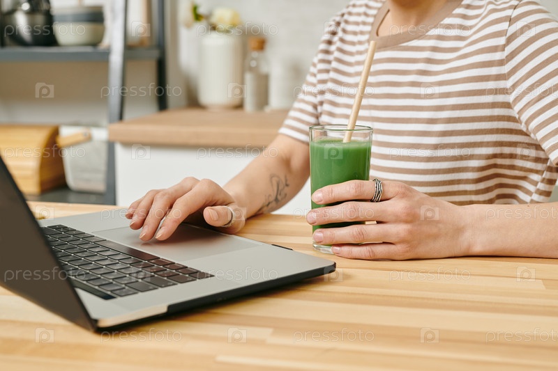 Человек, держащий напиток и использующий ноутбук у стола
