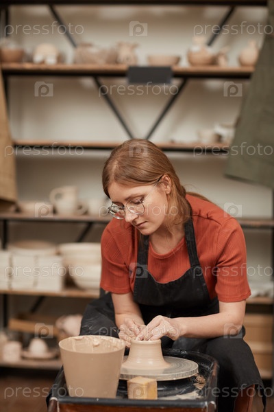 Художница, делающая керамику на гончарном колесе