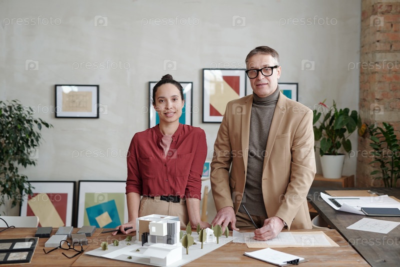 Молодая архитекторша и ее зрелый коллега-мужчина стоят за столом с моделью нового дома