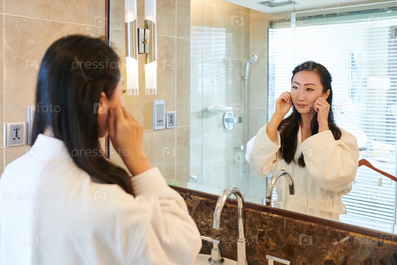 Молодая женщина массажирует лицо