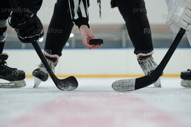 Рука судьи, держащей шайбу на ледовом катке с двумя игроками, стоящими вокруг него