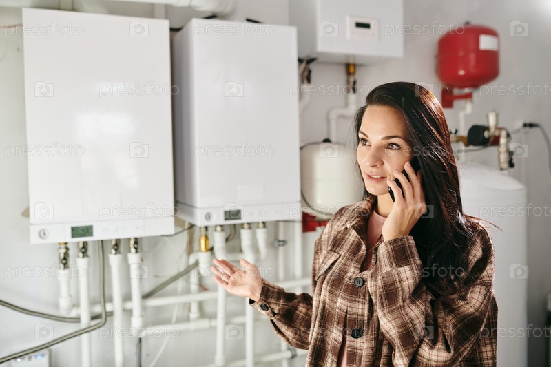 Молодая женщина держит смартфон за ухо, в то время как звонит ремонтнику
