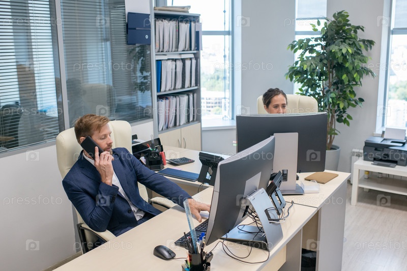 Молодой бизнесмен разговаривает по телефону с рабочим местом
