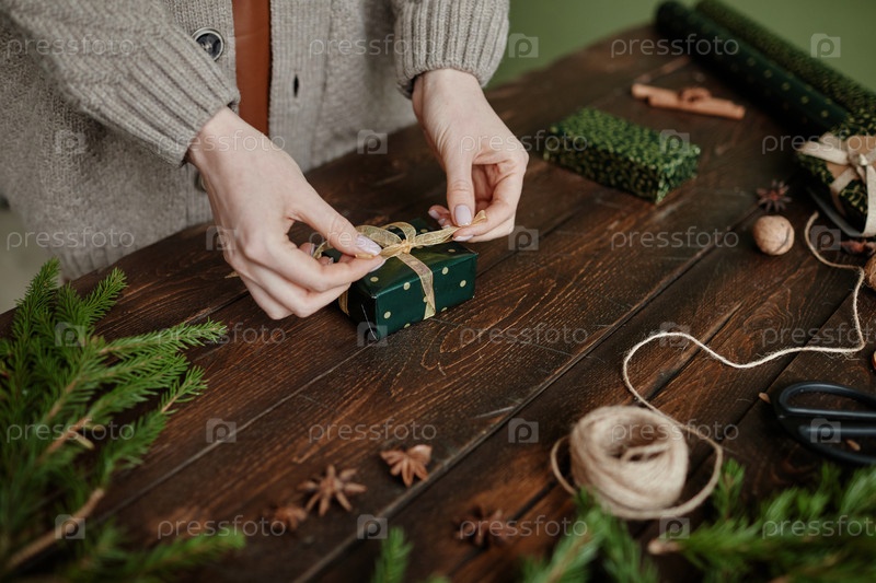Молодая женщина, упаковывающая рождественский подарок Close Up