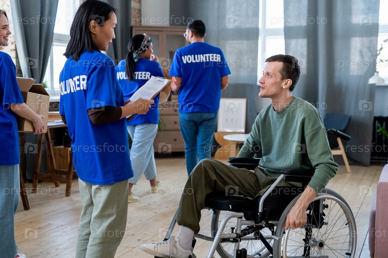 Молодая волонтерка стоит перед мужчиной в инвалидной коляске