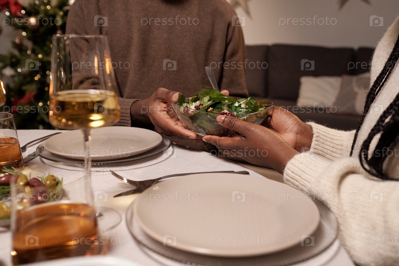 Руки молодой африканской пары, держащей миску с салатами