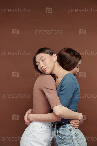 Две молодые близнецы в повседневной одежде, стоящие обнимаясь с закрытыми глазами