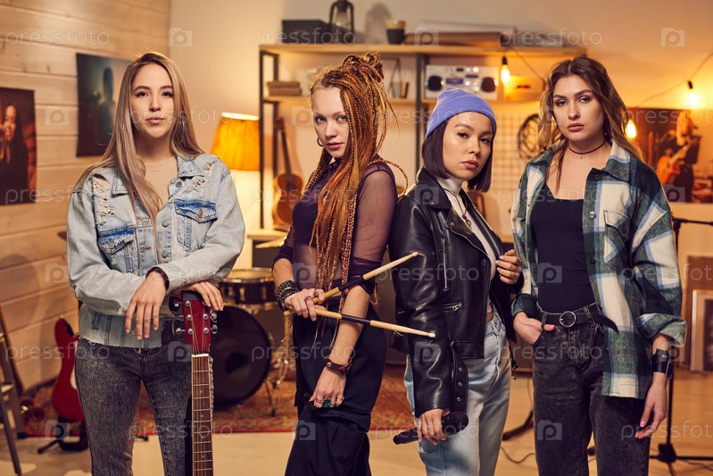 Девственная группа, состоящая из четырех женщин, стоящих в очереди