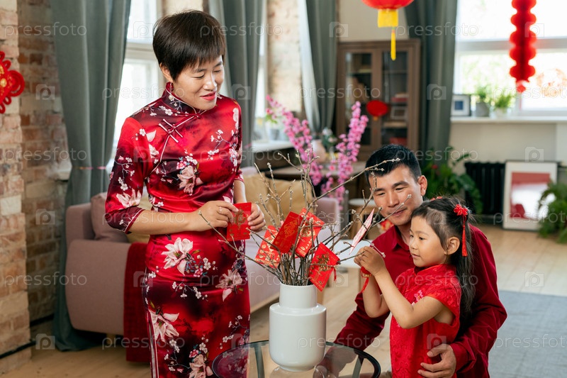 Молодая китайская семья из трех отделений украшения