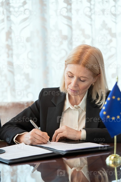 Зрелая блондинка-делегат ЕС подписывает договор о деловом партнерстве