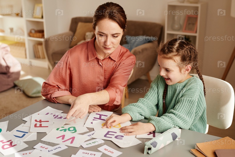 Девочка учит английский вместе с учителем