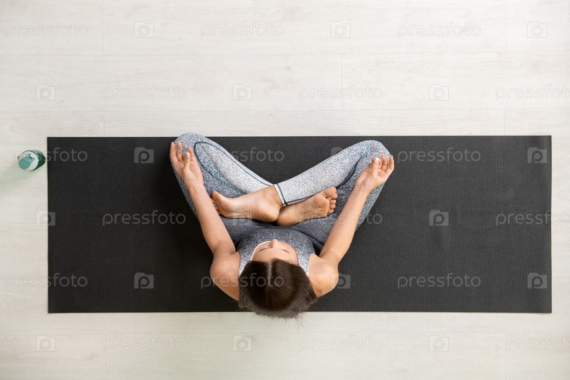 Вид молодой брюнетной спортсменки в спортивном костюме, сидящей на коврике в позе лотоса