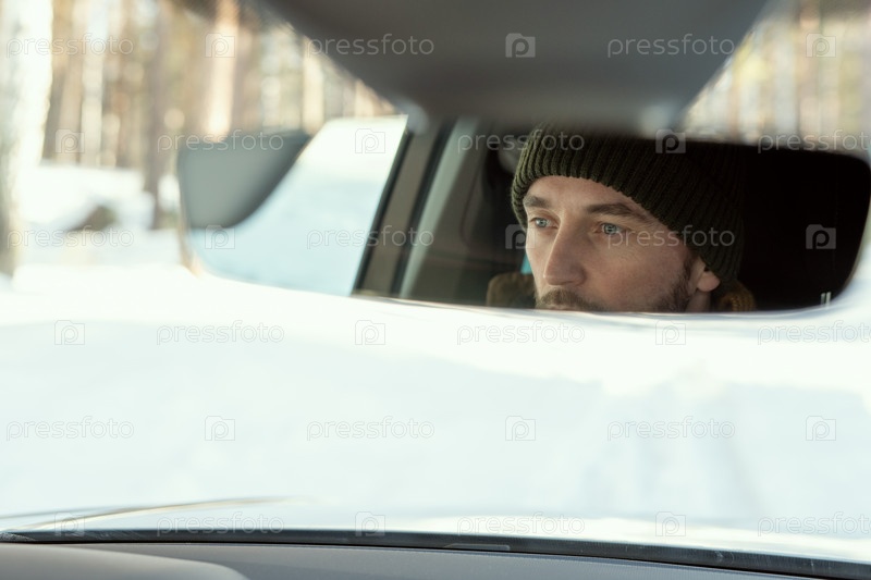 Отражение лица мужчины в зимней одежде, глядящего через переднее окно машины
