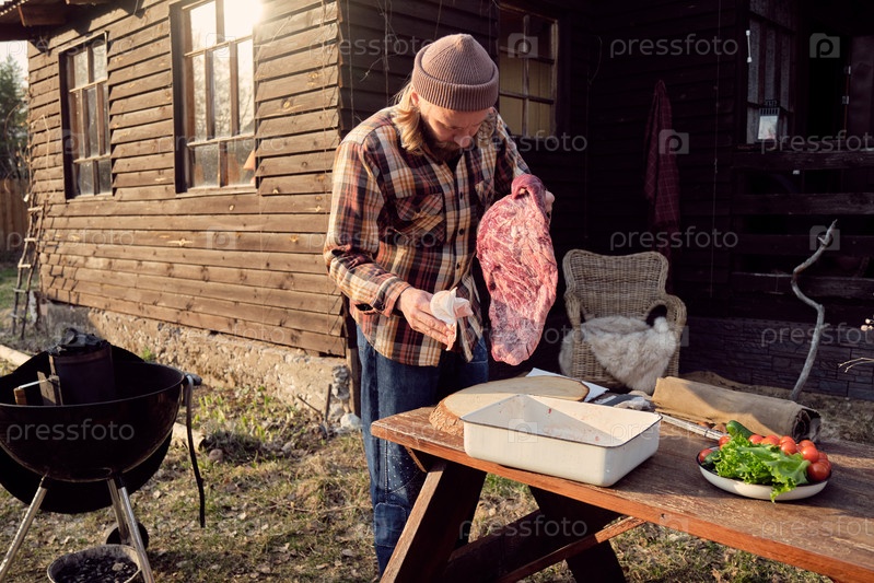 Мужчина готовит мясо на барбекю