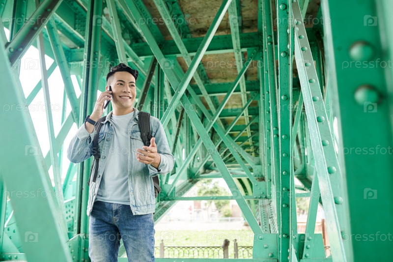 Улыбающийся парень, идущий под мостом