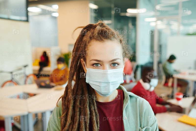 Молодая женщина-менеджер открытого пространства в защитной маске, скрестив руки за грудь