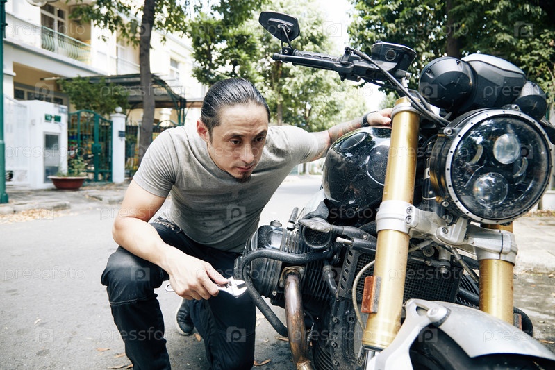 Человек с ключом проверяет сломанный велосипед